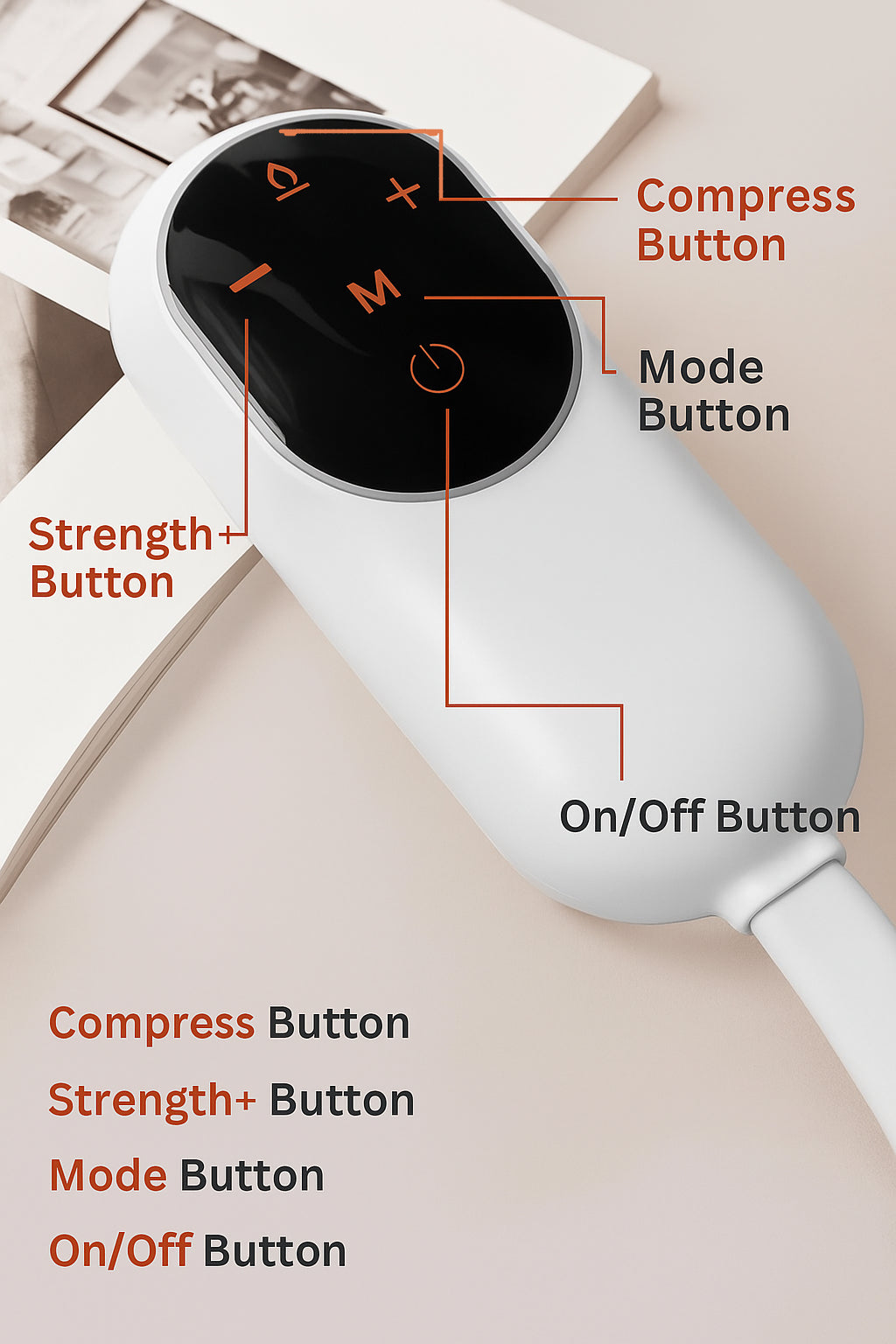 Switch between 6 therapeutic modes with ease. Use Compress for air pressure, Strength + / - to adjust intensity, M Mode to change patterns, and the On/Off button for instant control. Professional-grade relief, tailored at your fingertips.